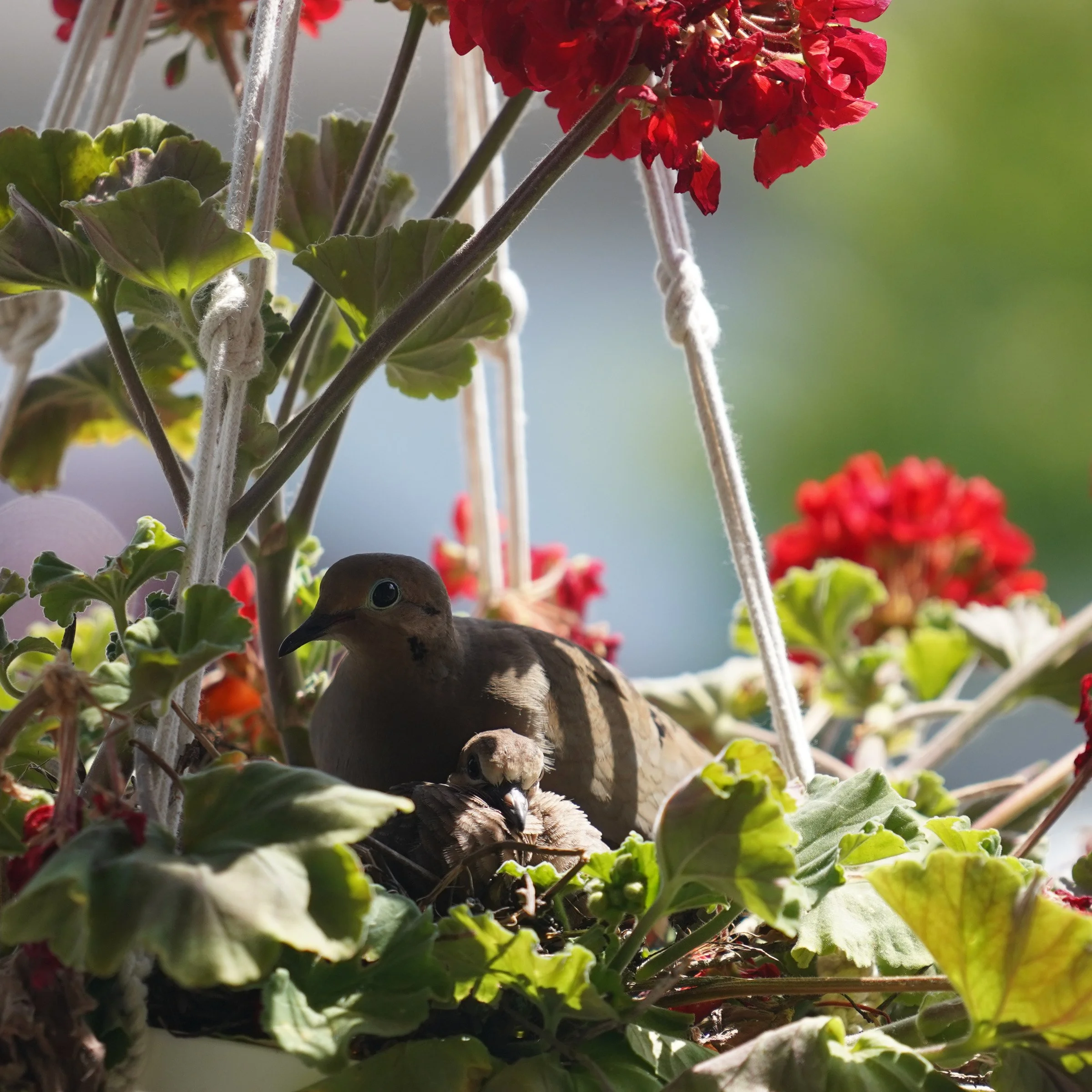 Mourning Dove, adult female and nestling in a Geranium sp. hanging basket, Genesee county, Michigan.