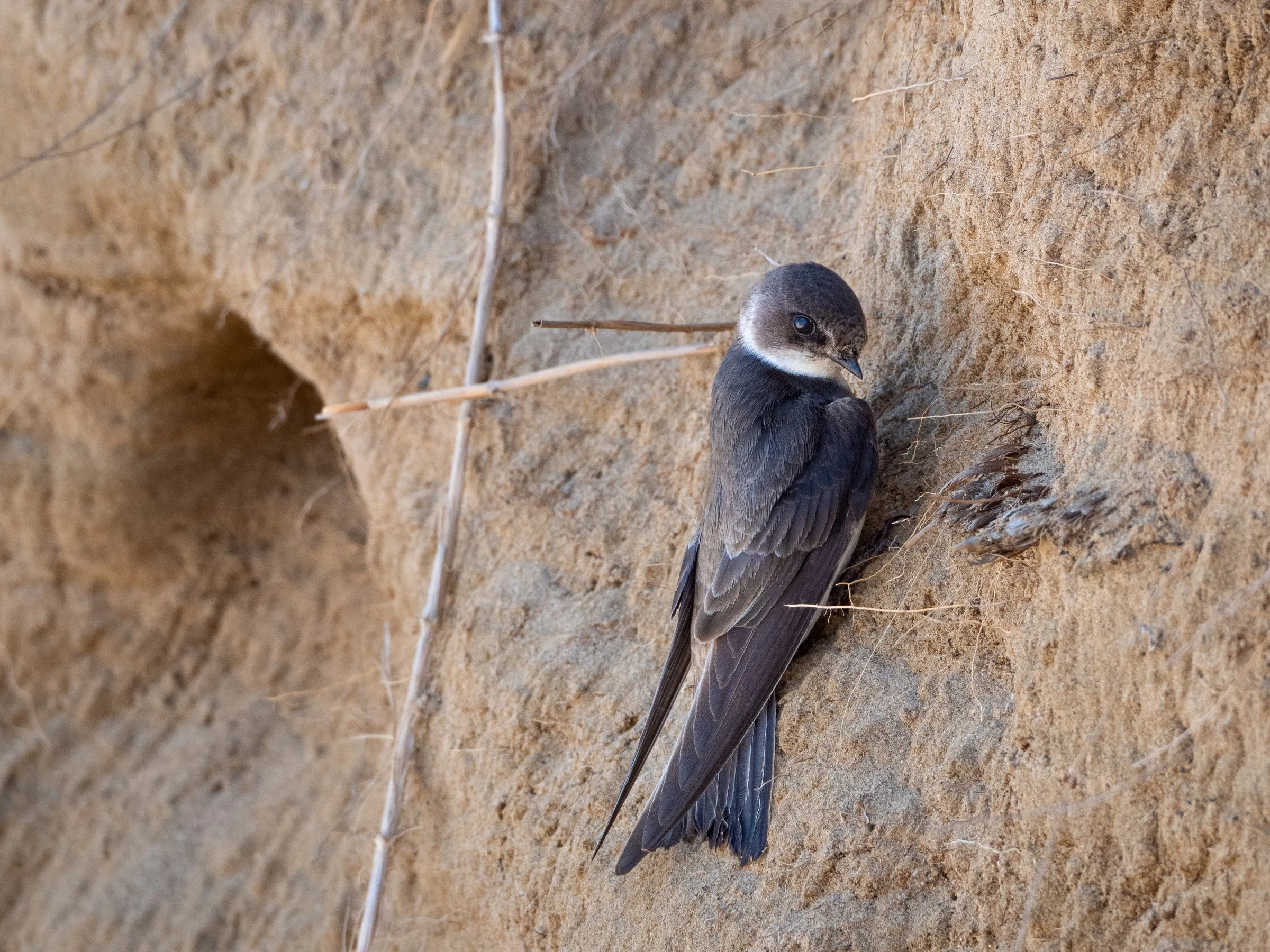 Most visitors to Montrose Point Bird Sanctuary during breeding season will have seen the many acrobatic swallows the area boasts. One species in particular has its nests out in the open for all to see – or at least the entrance to their nests. Bank Swallows build their nests in sand banks, and at Montrose there is a protected section of sand bank that contains an estimated 150 nests of these colonial nesters. The swallows return to this site year after year, refurbishing and reusing nest holes from previous years. If an unmated male Bank Swallow is looking to attract a mate, he will begin digging out a burrow and then fly around its entrance, singing, to attract a female. If a female is interested and chooses him as her mate, both the male and female will work steadily, using their small conical bills, feet, and wings to remove earth, progressing about 5 inches per day. As they dig further into the bank, they kick out dirt from the burrow. These tunnels range from 10 to 60 inches in length; the average length is 28 inches. The end of the tunnel is where the pair deposit plant stalks, grass stems, and similar nesting material, and eventually the female deposits 4 to 6 eggs. Once incubation has started, feathers are added to the nest. Incubation is managed by both parents, as is feeding. Chicks are fed flying insects caught by the parents, carrying them back through the tunnel to the nest. As the chicks get older, they will come to the opening of the tunnel to be fed.