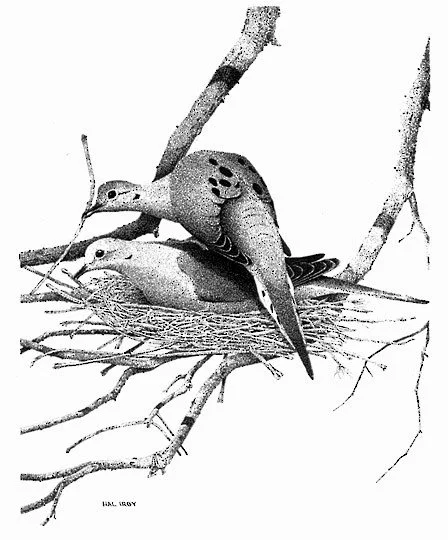 The female lays two eggs which are incubated by both parents, with the female taking the duty during the night, the male during the day. There are typically 2 to 3 broods. Mourning Doves are seed eaters, but what they feed their young for the first few days is called “crop milk”, a cheesy product of the dove’s crop that is high in fat and protein. The crop milk is regurgitated into the nestlings' mouths, as are seeds as the babies grow older.